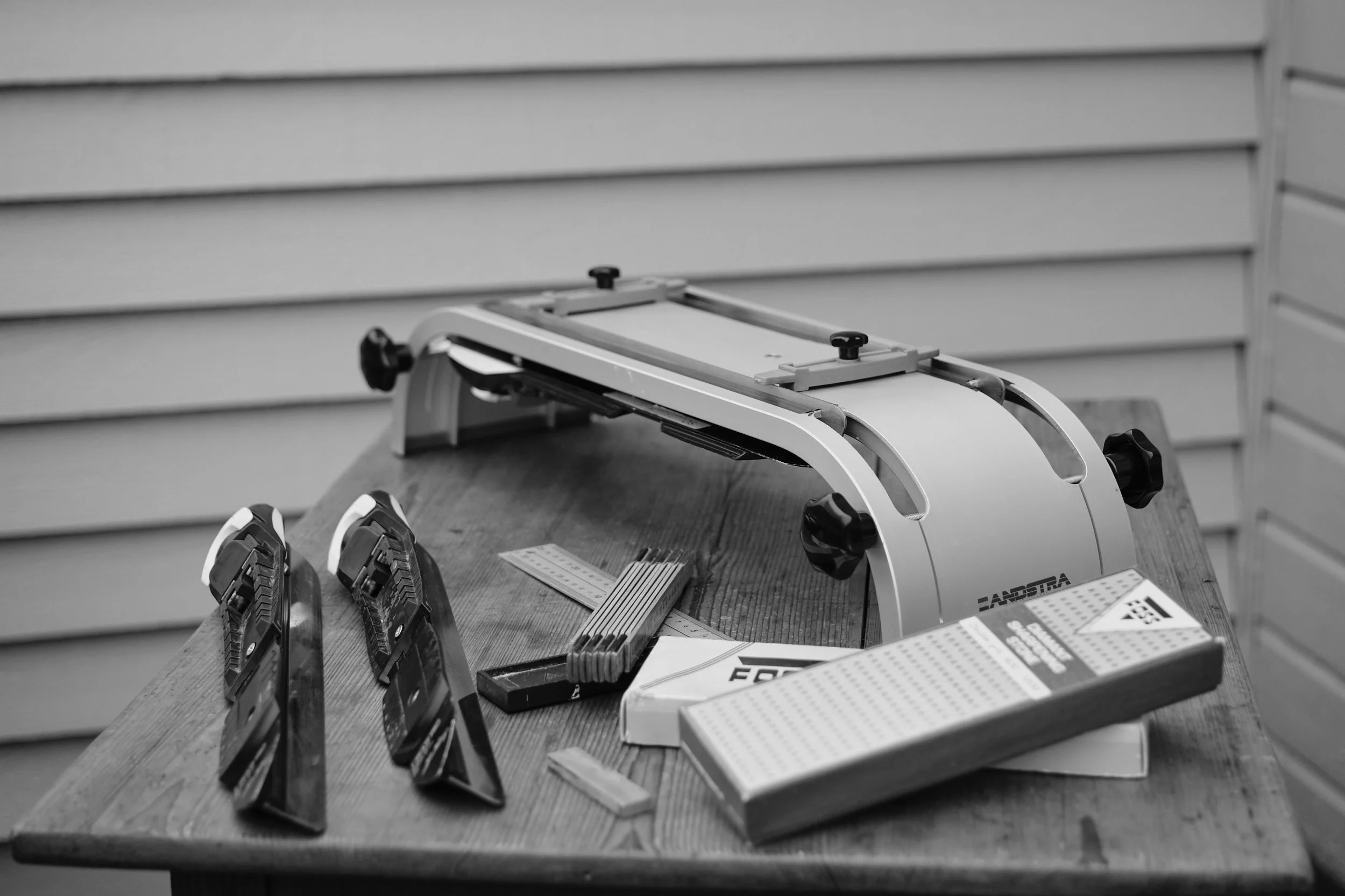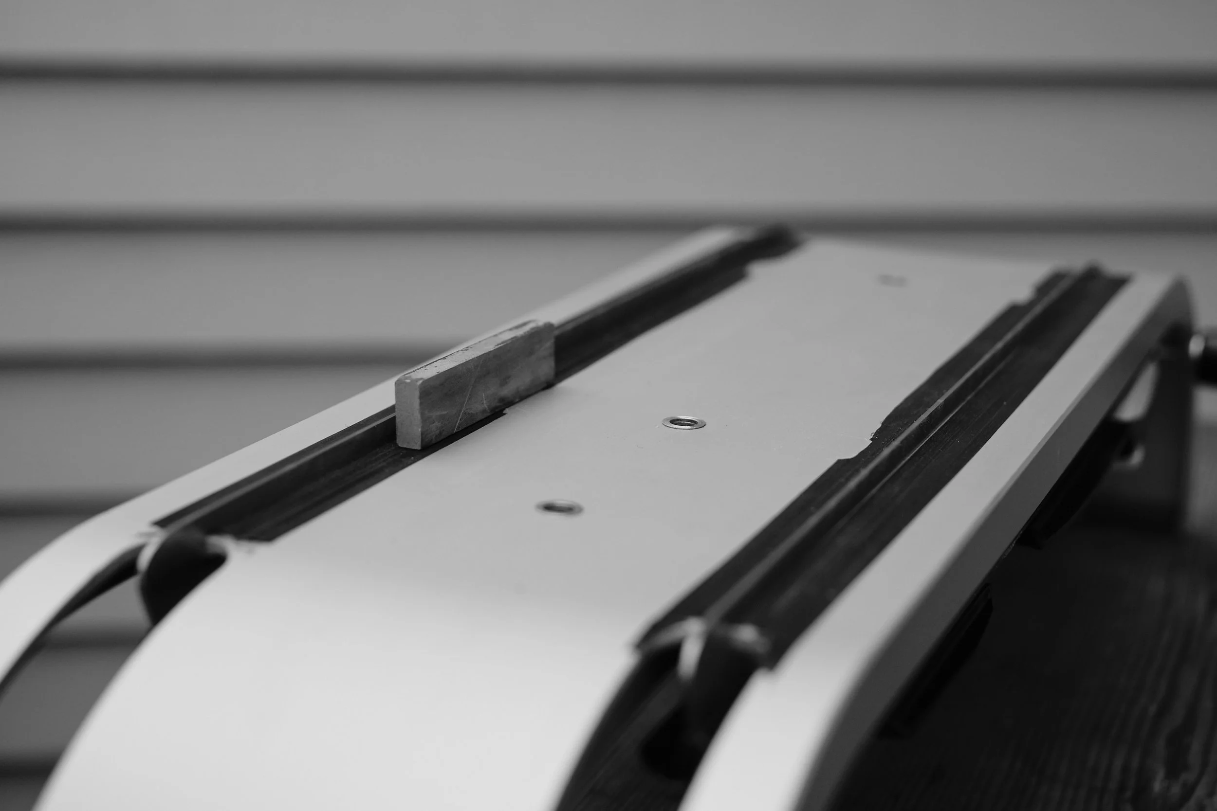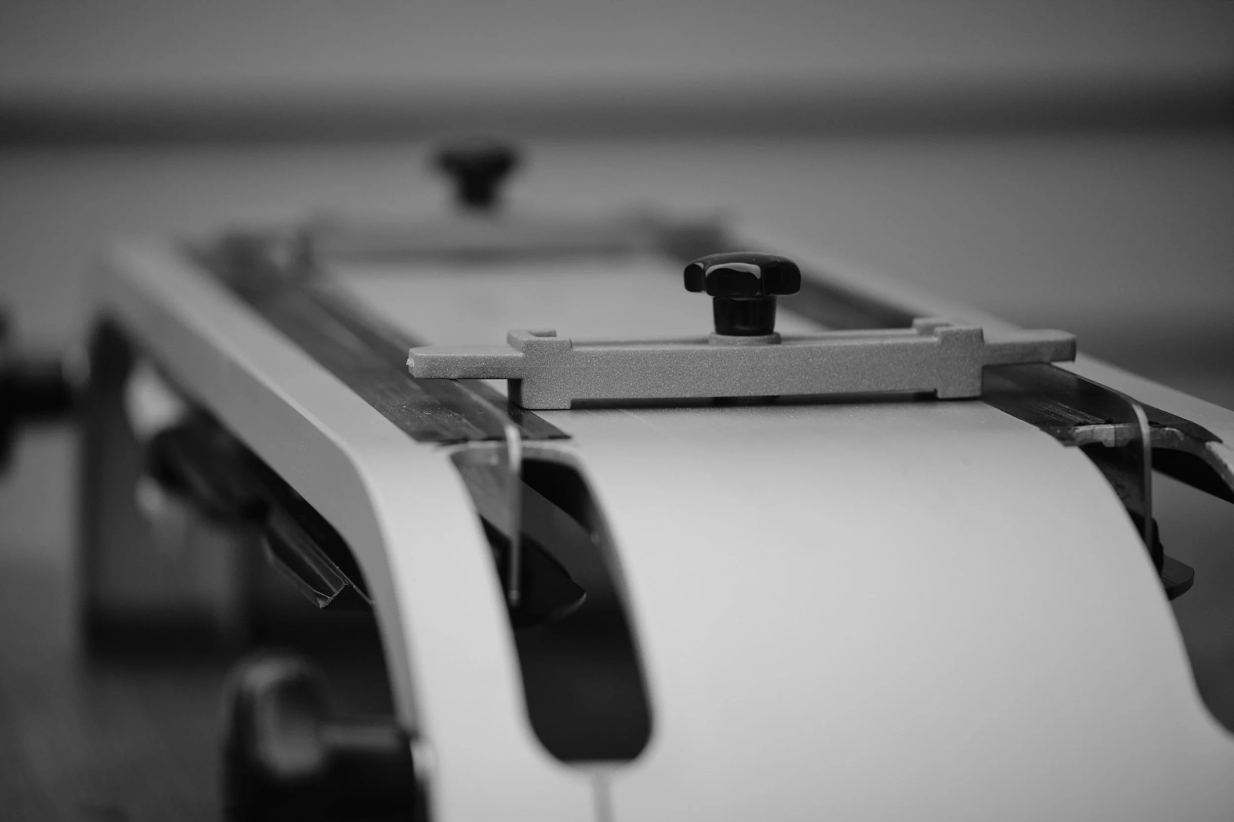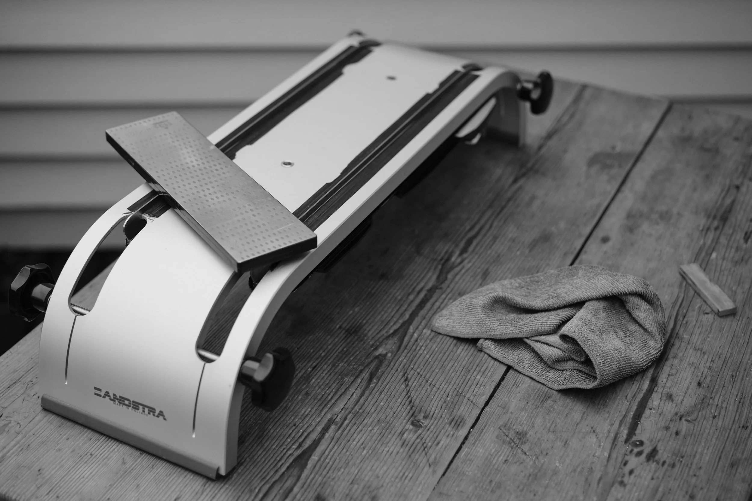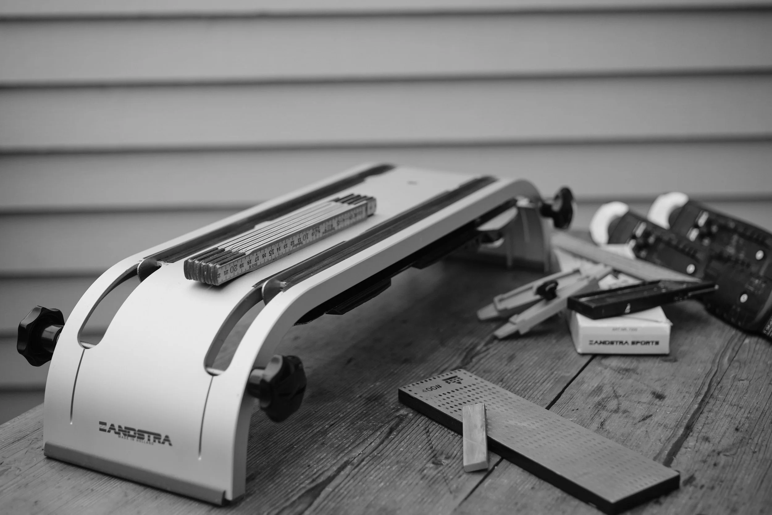 På dette stativet er det to avtakbare stoppere på tvers, som skøytene settes mot for å bli helt parallelle